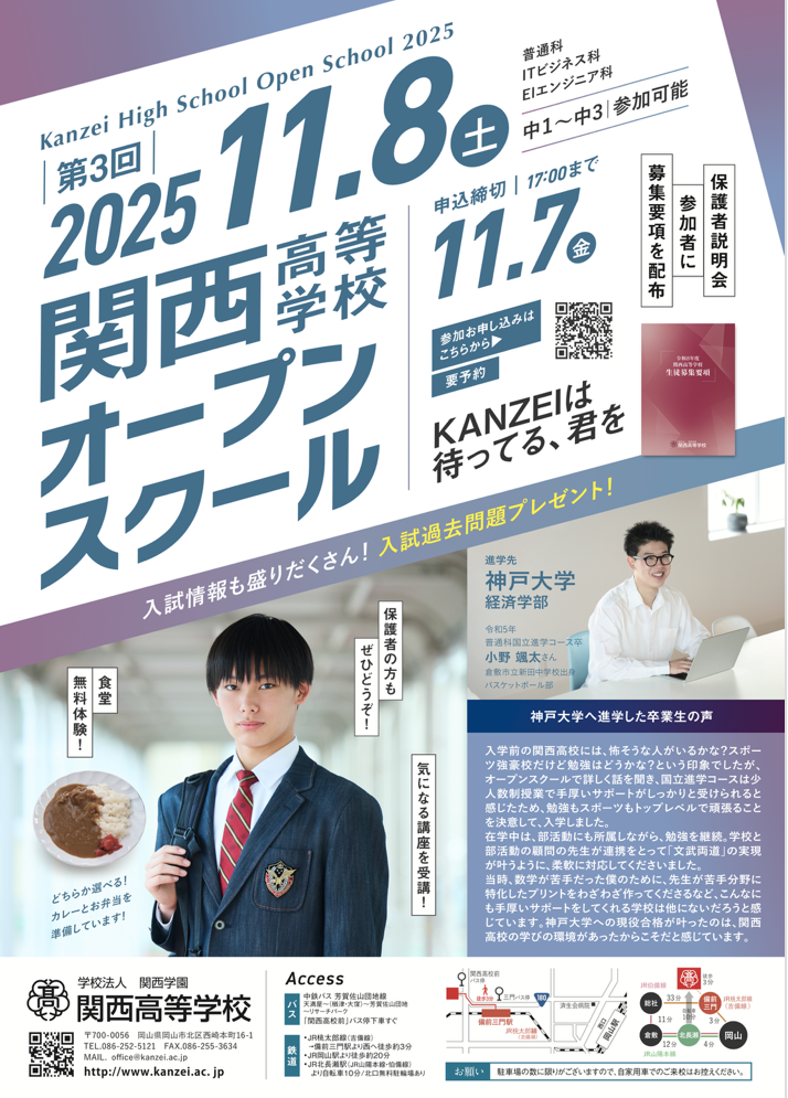 今年度、最後のオープンスクールです!!関西高校にてお待ちしています!