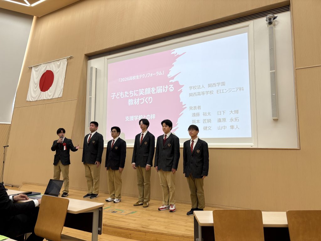 1月17日(土)に岡山県内の工業高校が集まり、生徒の研究発表大会「2026高校生テクノフォーラム」が環太平洋大学で行われました。EIエンジニア科は岡山県内の支援学校と共同で「教材の開発」や「おもちゃのお医者さん」の活動を行っています。この活動は、平成27年度から始まり先輩から引き継いできたものです。その活動について「笑顔を届ける教材づくり 支援学校との絆」として発表を行いました。発表前は緊張していたのですが、本番では堂々とした態度で発表を楽しんでいました。優秀賞(2位)を頂くことができました。今後もこの活動を後輩に引き継いでいきたいと思います!!