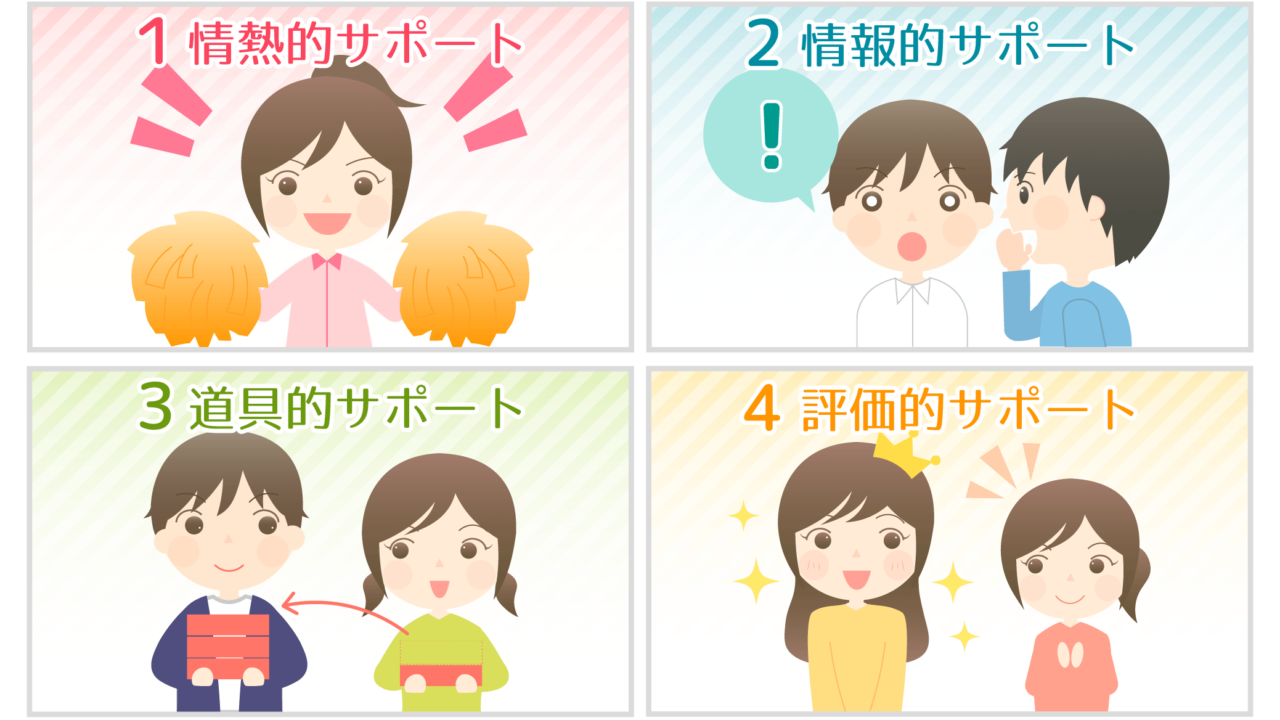 情熱的サポート・情報的サポート・道具的サポート・評価的サポートの4つのサポートがあります。一般には情熱的サポートをソーシャルサポートとみなしがちでですが、「相手を高く評価する」だけでもサポートなんですね。「共感」もちろんサポートです。